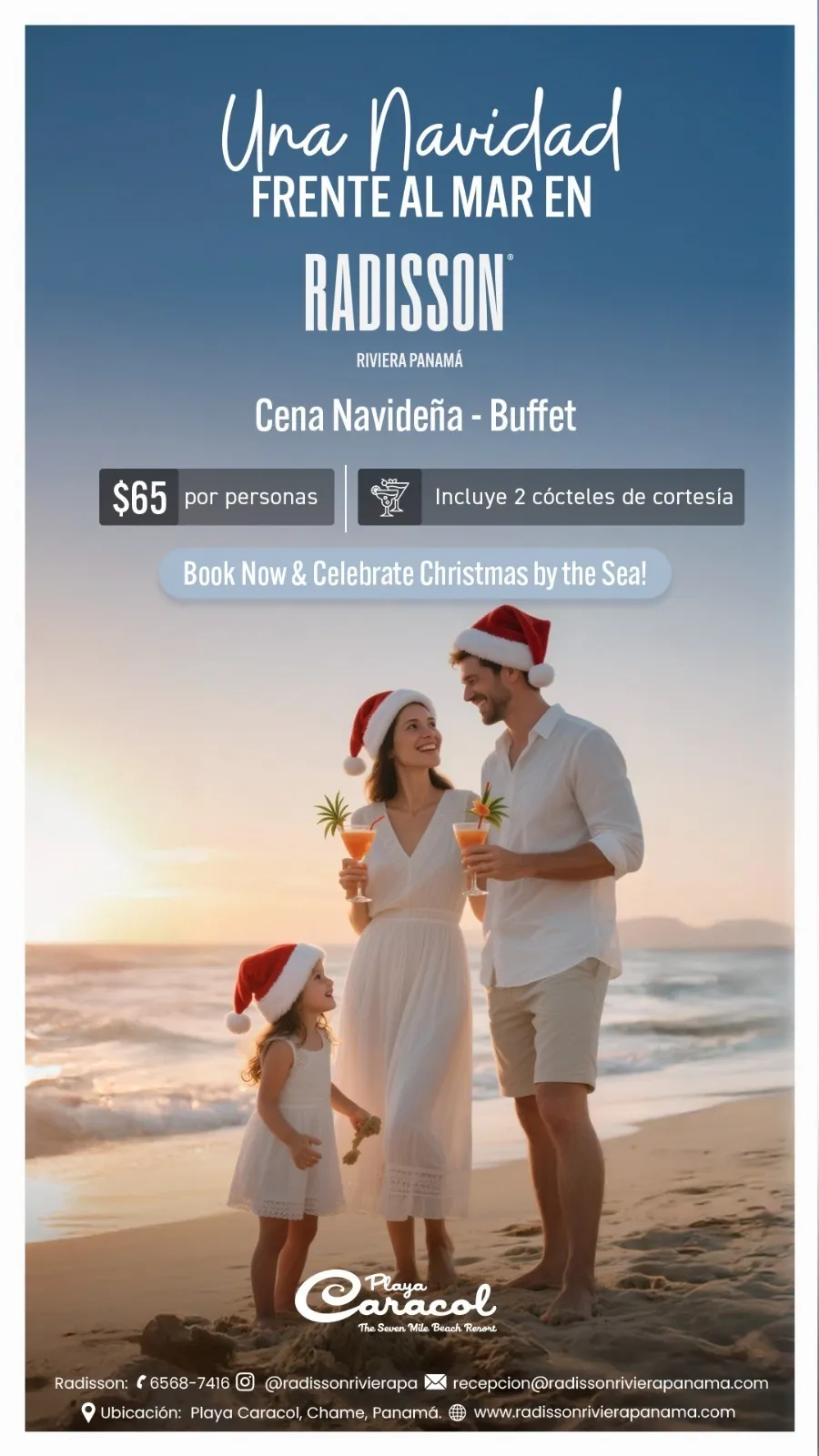 Celebra una Noche Buena inolvidable frente al mar en Radisson Riviera Panamá. Disfruta un exquisito buffet navideño preparado por nuestro chef, con estaciones especiales, sabores tradicionales y un ambiente cálido junto a la playa.